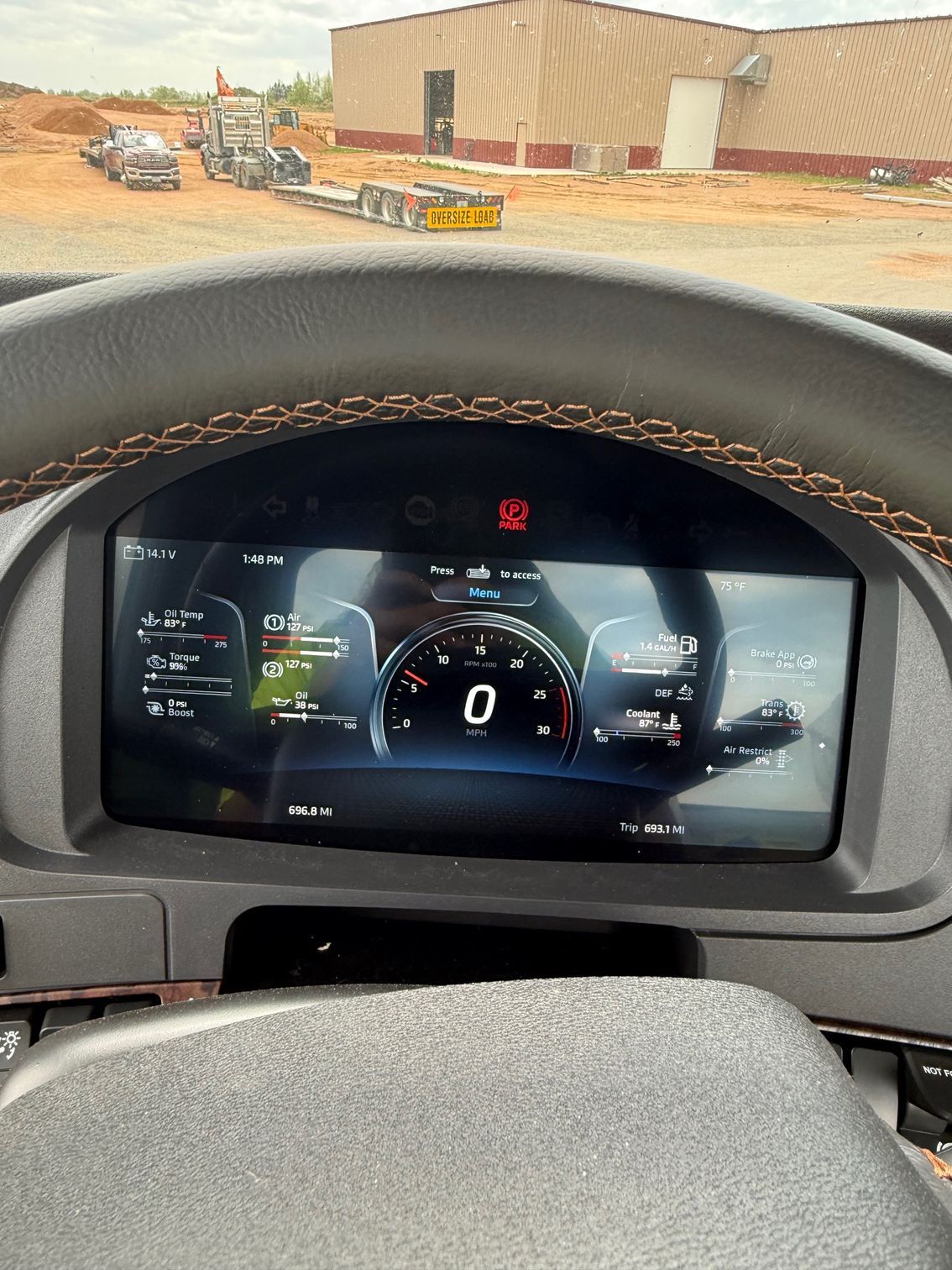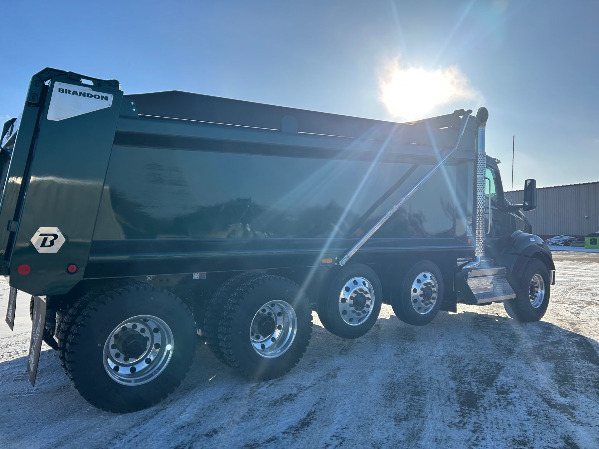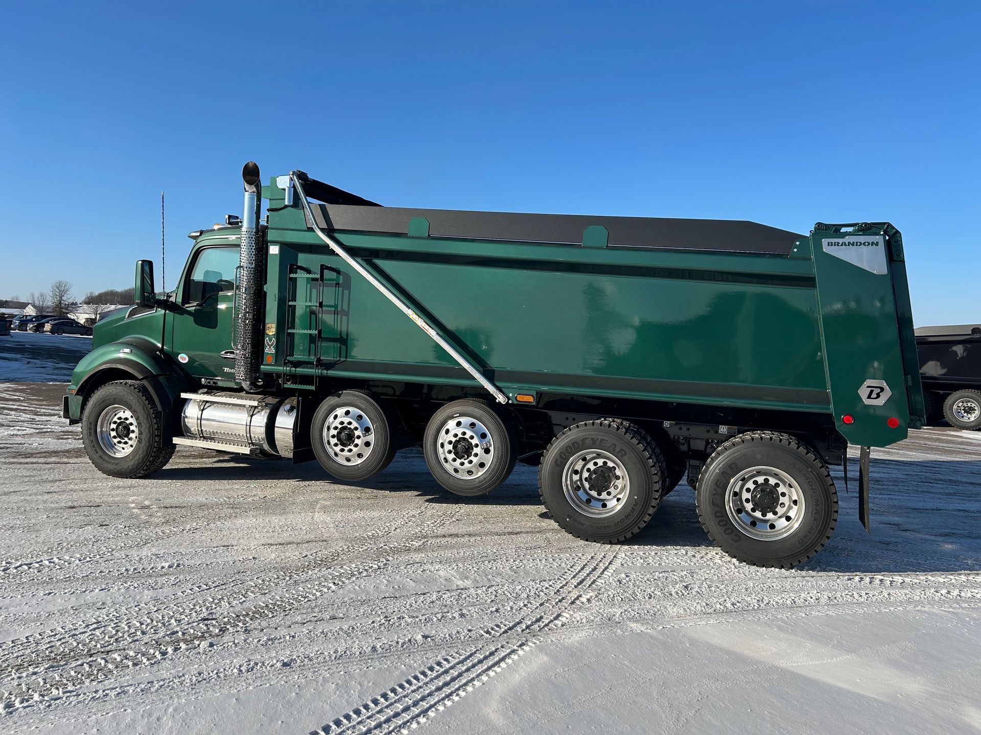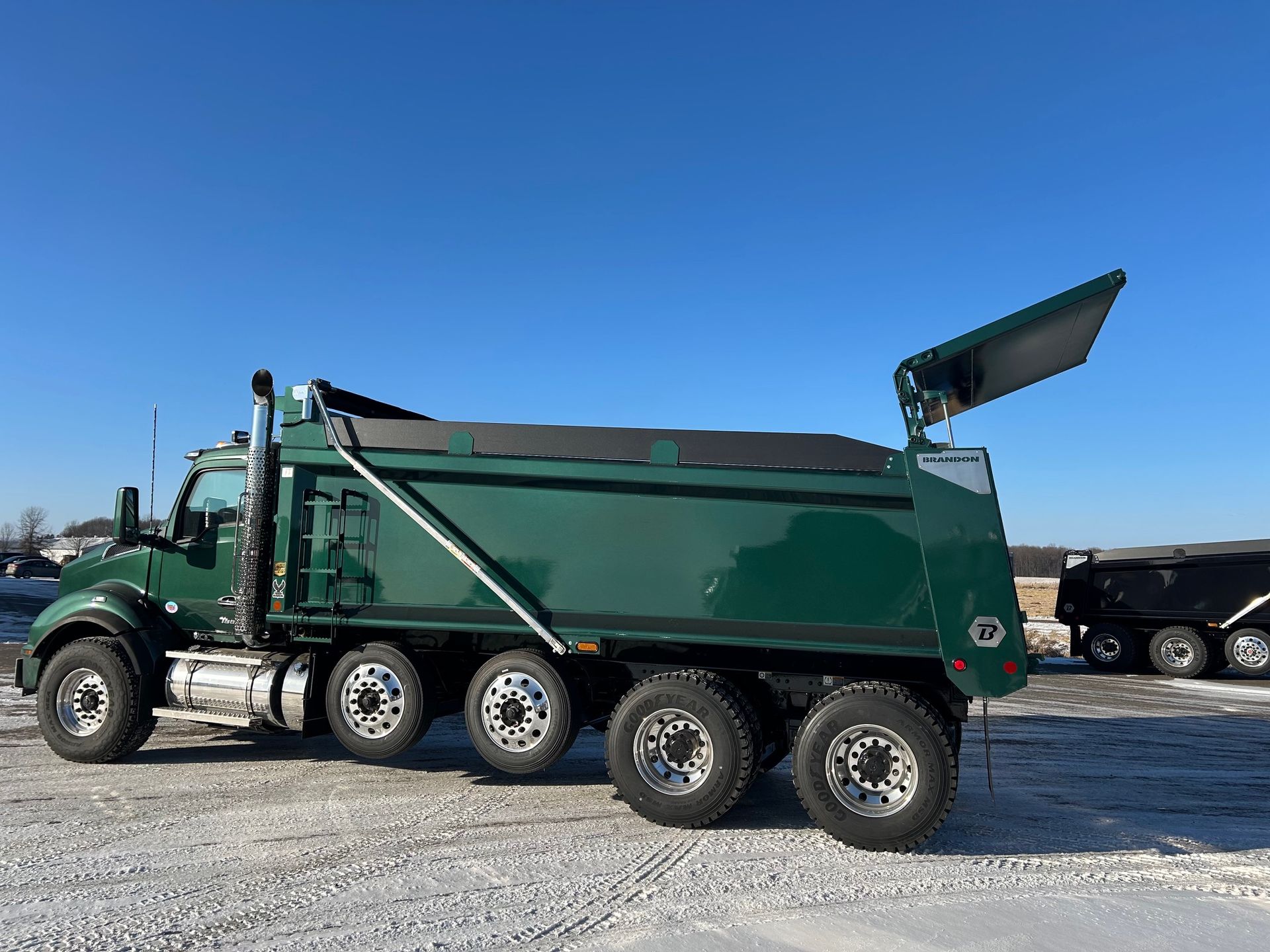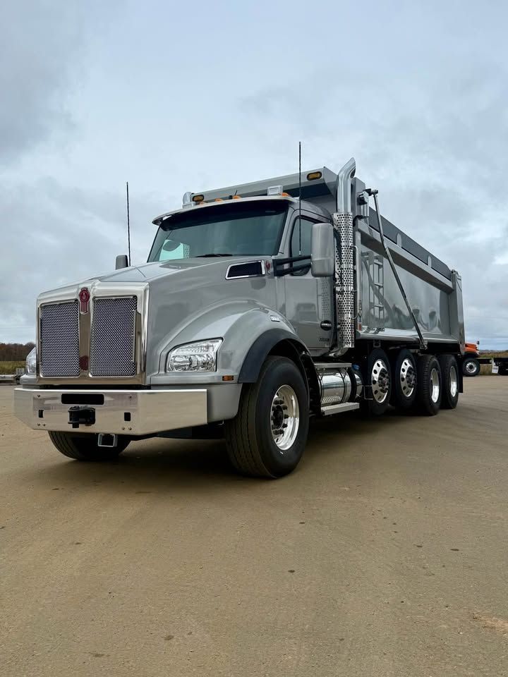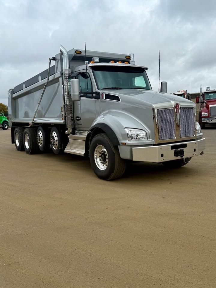 Details: Truck is equipped with Diamond interior and ultra leather seats. Includes touch screen navigation and Apple CarPlay capabilities. Truck is upfitted with a 19.5 FT Brandon High Lift dump body with a 3/16" floor. Also equipped with a vibrator, electric Aero tarp system, and strobe lights. Additional equipment upgrades and options available upon request.